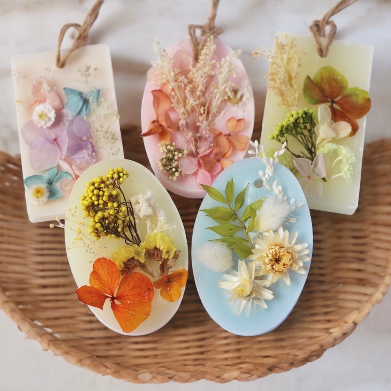 火を灯すのは勿体無いと考える方にはインテリアとして香りを楽しむサシェもオススメ。70種類以上の顔料の中からお好きな色にロウを着色したり、香りもたっぷり閉じ込めて製作します。立体的にお花をデコレーションして楽しくアレンジメントしてみましょう。