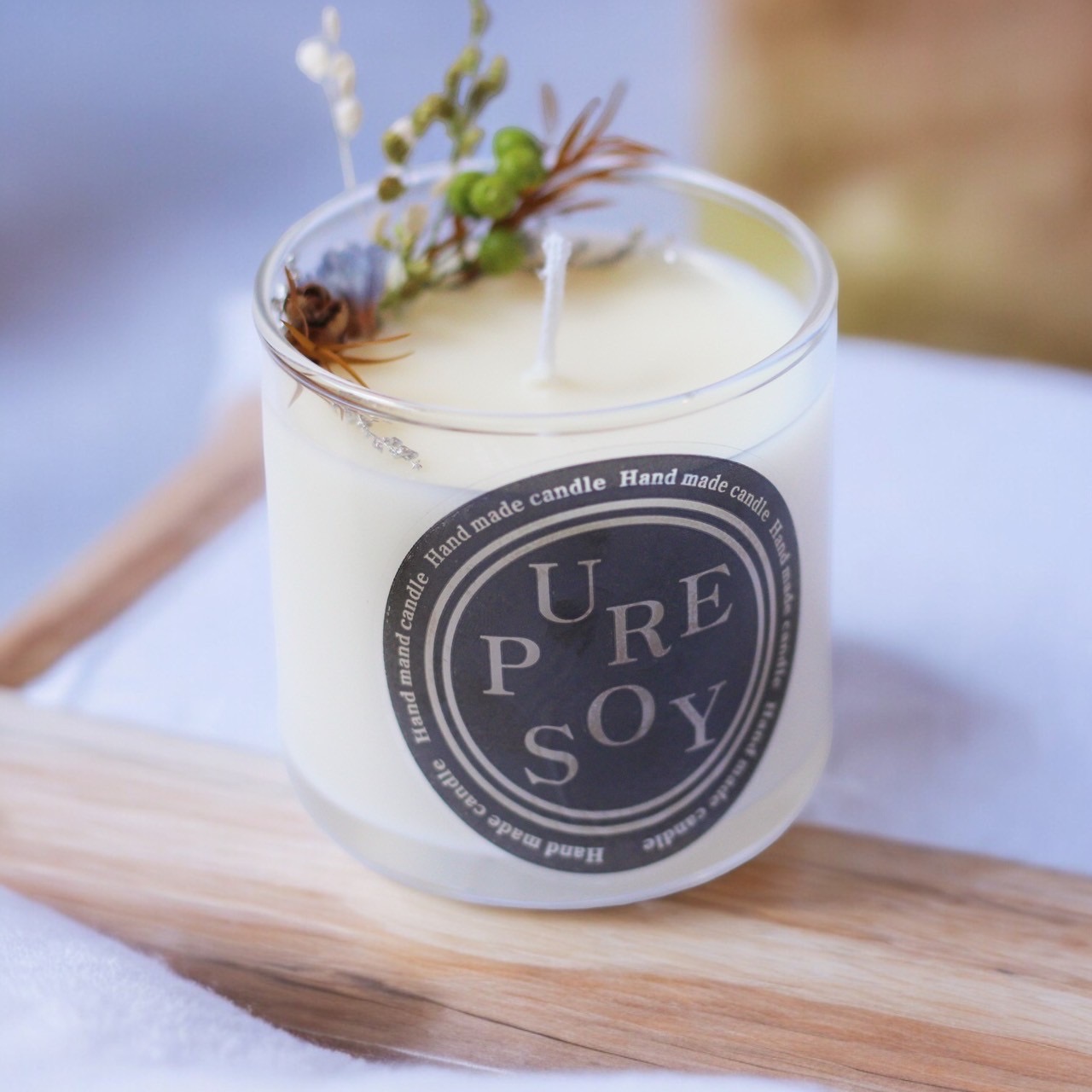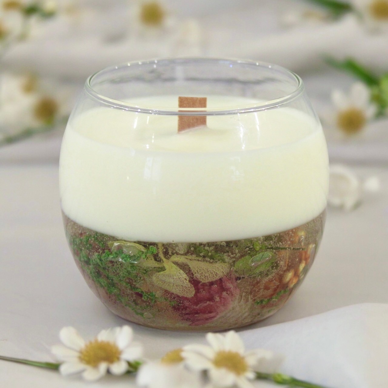 クリアなジェルキャンドルとクリーミーなソイワックスで仕上げる2トーンのアロマキャンドル。たくさんの花材の中から自由にお花を選択できます。木芯を使っているので灯すとパチパチと焚き火のように木が燃える音も楽しめます。 視覚、聴覚、嗅覚で楽しめるナチュラルなアロマキャンドルです。