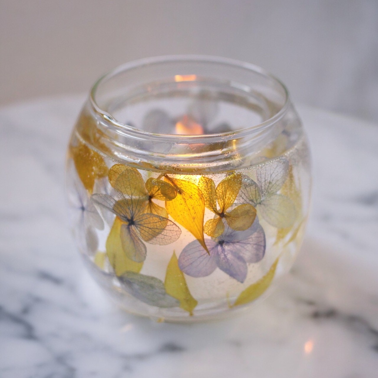クリアなジェルキャンドルを使い、まるでハーバリウムのようなクリアなお花のキャンドルホルダーを製作します。内側にもグラスが入っているため中に小さなティーライトキャンドルを入れたら繰り返しの使用が可能です。