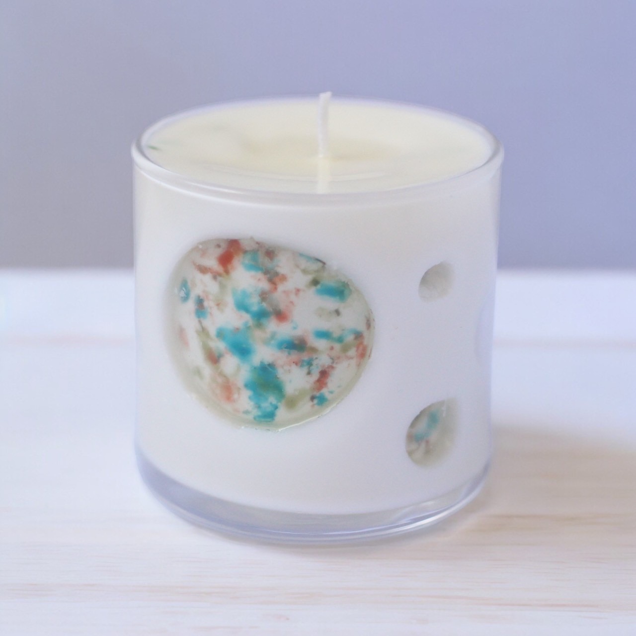 かわいいドット柄のアロマキャンドル。丸の窓の部分にはお好きな色を閉じ込めて奥行きのあるデザインに仕上げます。天然のソイワックスを使用。香りも選べる、見た目もかわいい人気のアロマキャンドルです。