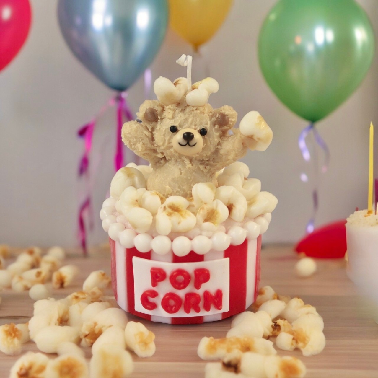 本物そっくりかわいいポップコーンキャンドル。 ポップコーンも粘土のようにロウをこねて作ります。バケットのストライプカラーは自由に変更可能。食いしん坊のかわいいくまさんも添えて 作りごたえ満点の作品です!
